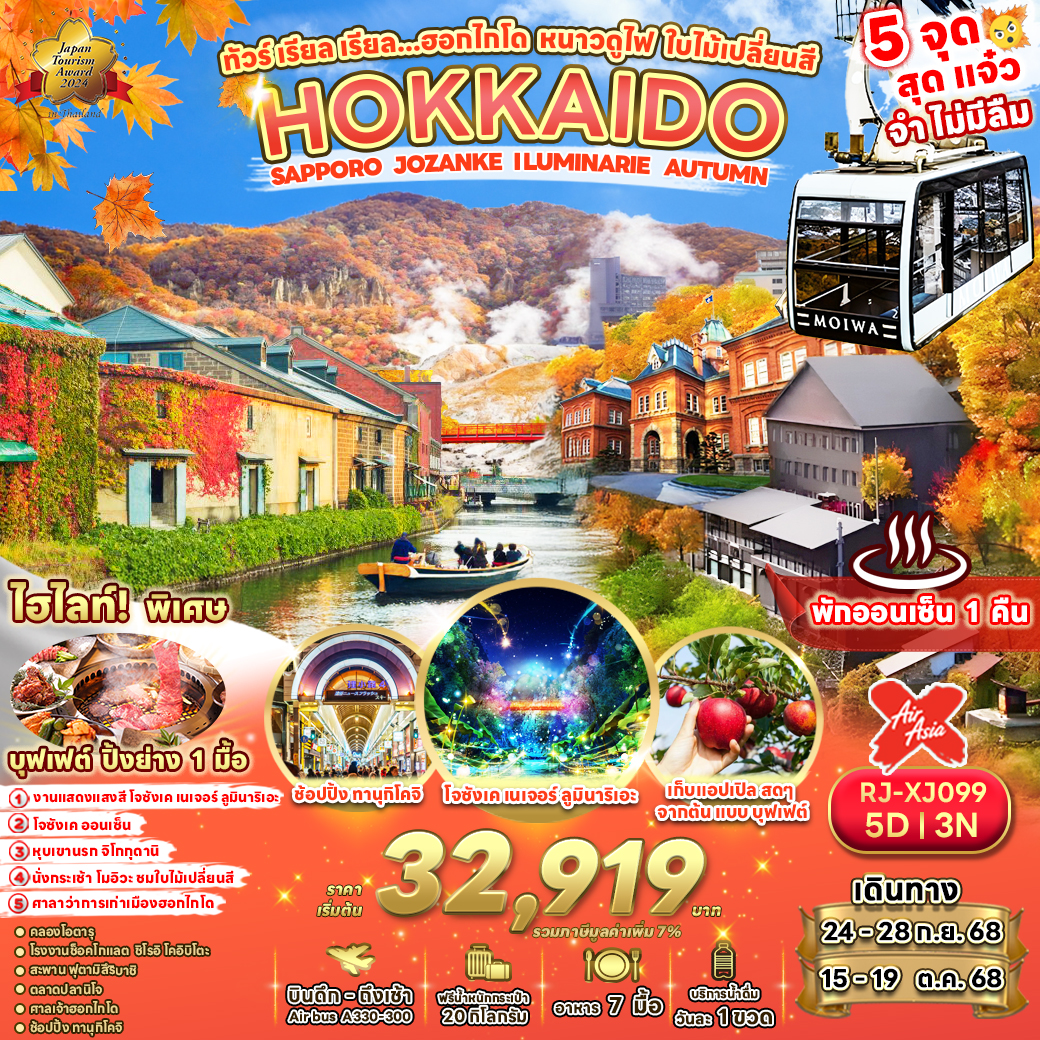 ชม หมู่บ้านเทพนิยาย นิงเกิ้ลเทอเรส หมู่บ้านกลางป่า คล้ายบ้านในเทพนิยาย น้ำตกชิราฮิเกะ 1 ใน 5 ของน้ำตกที่สวยที่สุดบนเกาะฮอกไกโด ชม สระอะโออิเคะ(Aoiike) หรือที่เรารู้จักกันอีกชื่อนึงว่า “สระน้ำสีฟ้า(Blue Pond)” สนุกสนานกับกิจกรรมมากมาย ณ ลานสโนว์ เวิลด์ ชิคิไซพาโนราม่า เดินชม คลองโอตารุ ในบรรยากาศสุดแสนโรแมนติก เข้าชม พิพิทธภัณฑ์กล่องดนตรี พร้อมชม นาฬิกาไอน้ำโบราณ ช้อปปิ้งจุใจ อิออน เมืองอาซาฮิคาว่า และ ช้อปปิ้งจุใจ ทานุกิโคจิ เป็นย่านการค้าเก่าแก่ของเมืองซัปโปโร อิ่มอร่อย!!! บุฟเฟต์ชาบู ชาบู+ขาปูยักษ์ 3 ชนิด แห่งเกาะฮอกไกโด