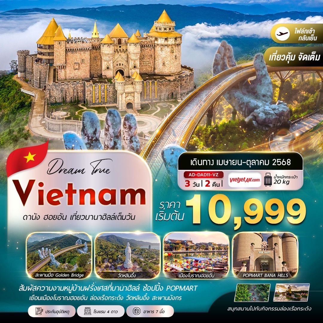 เที่ยวเวียดนาม ชมเสน่ห์ เมืองเก่าฮอยอัน เมืองมรดกโลกริมแม่น้ำทูโบน สัมผัส สวนลอยฟ้ามหัศจรรย์ Golden Bay ขึ้น กระเช้าไฟฟ้าบานาฮิลล์ ยาวที่สุดในโลก ตื่นตา สะพานมือ แลนด์มาร์กดังระดับโลก ล่องเรือกระด้ง กิจกรรมยอดฮิตของเวียดนาม สักการะ เจ้าแม่กวนอิมวัดหลินอึ๋ง สูงที่สุดในเวียดนาม จิบกาแฟชมทะเลสุดชิลล์ที่ มารีนาคาเฟ่ นั่งรถรางชมวิวขึ้นเขาสู่ บานาฮิลล์ ชม โบสถ์สีชมพู สถาปัตยกรรมสไตล์โคโลเนียล ช็อปปิ้งจุใจที่ ตลาดฮาน กลางเมืองดานัง